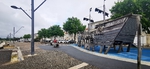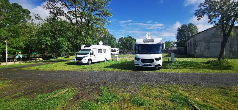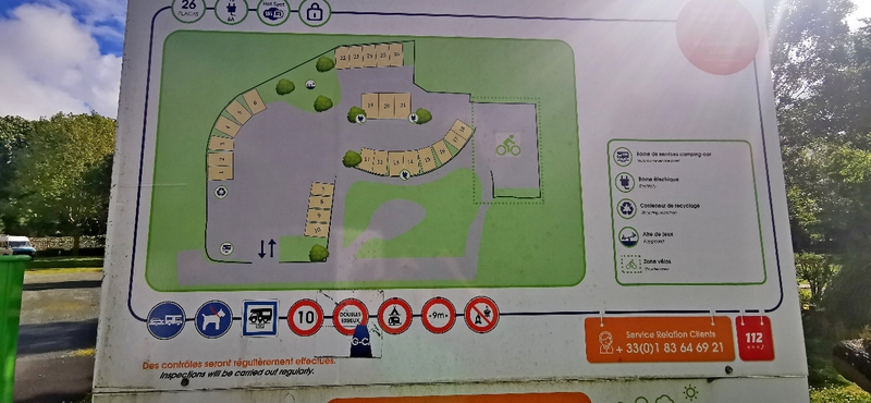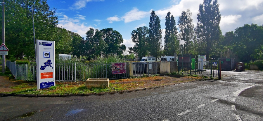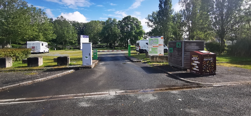 Entrée bien dégagée et facile sur une petite place. Les containers poubelles sont avant l'entrée à gauche et la zone de services à gauche après l'entrée. Zone de services bien dégagée. Les équipements pour cassette et eau potables sont "artisanaux" et pas très pratiques.